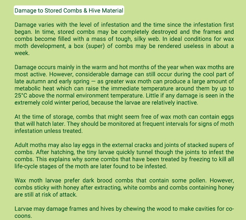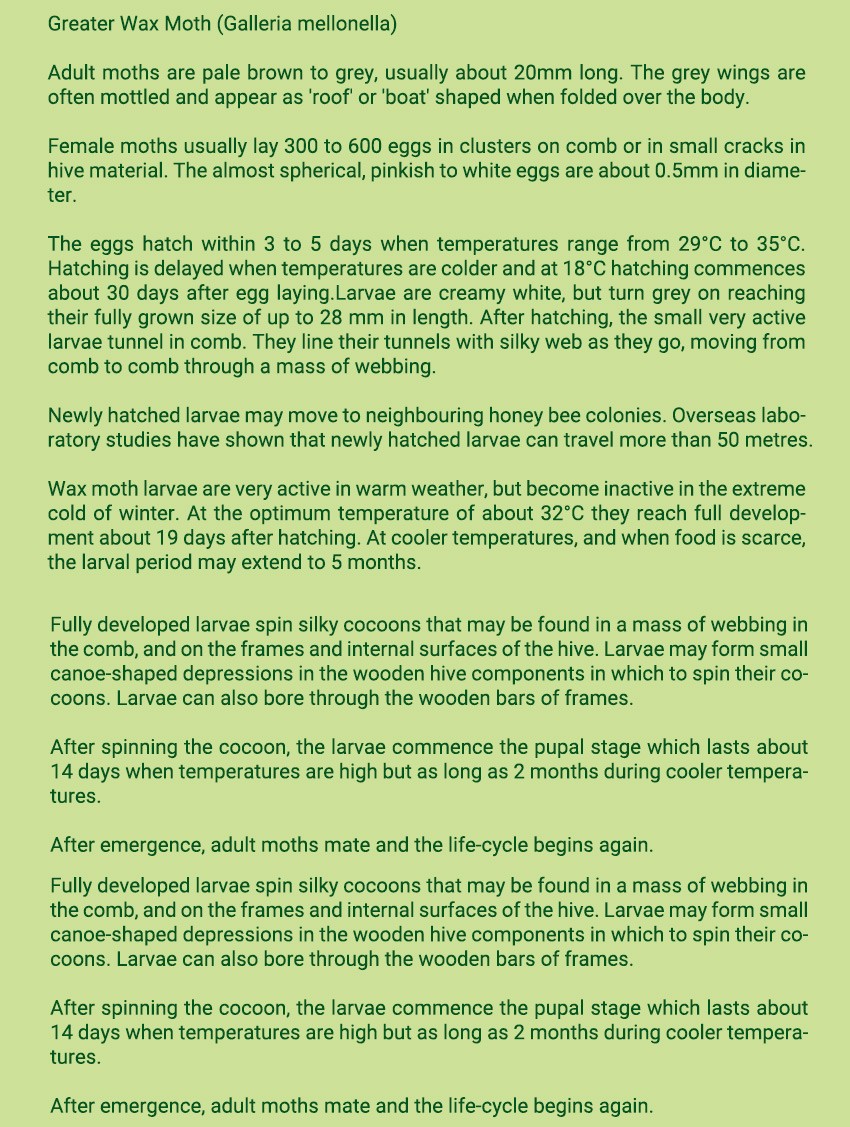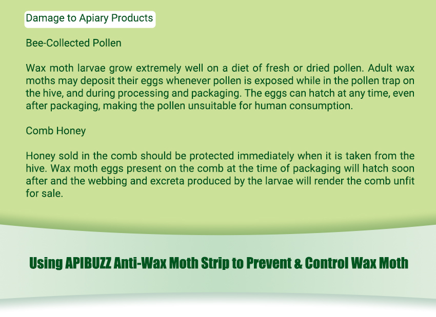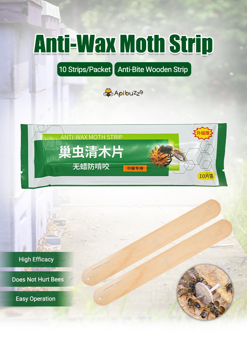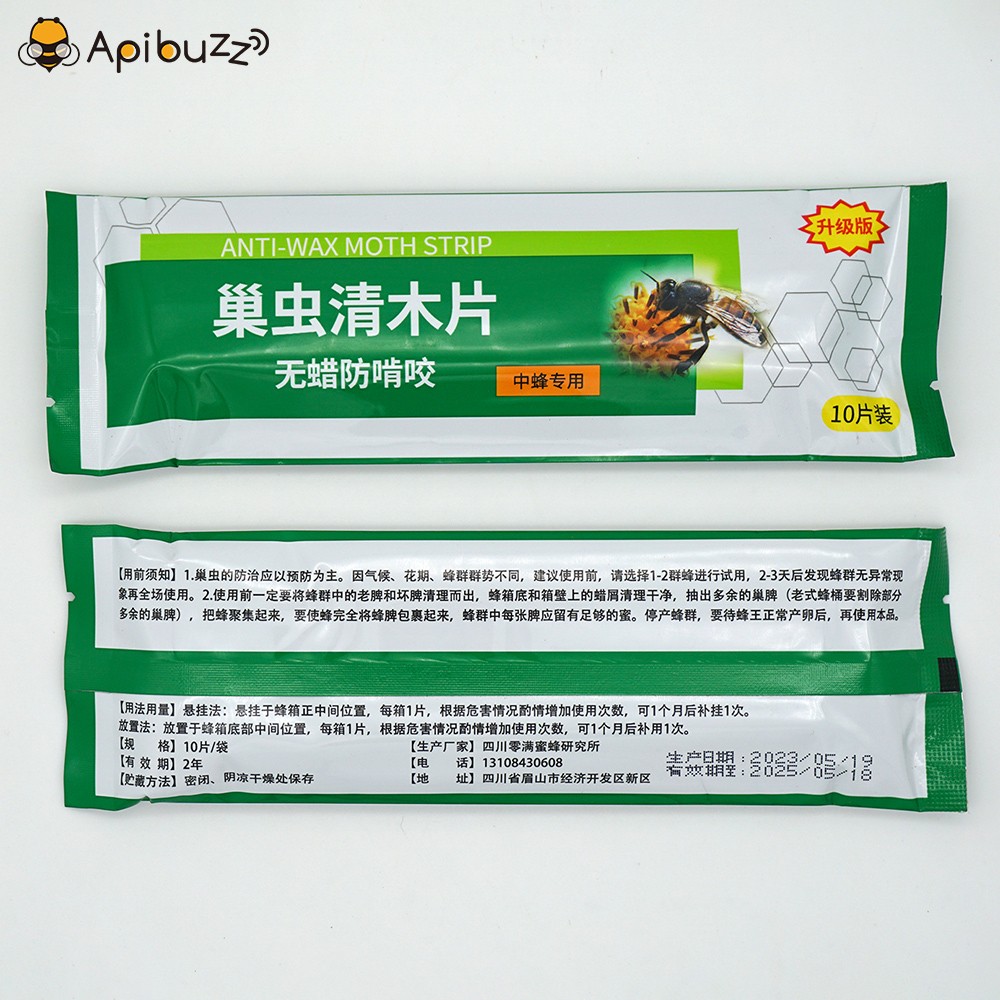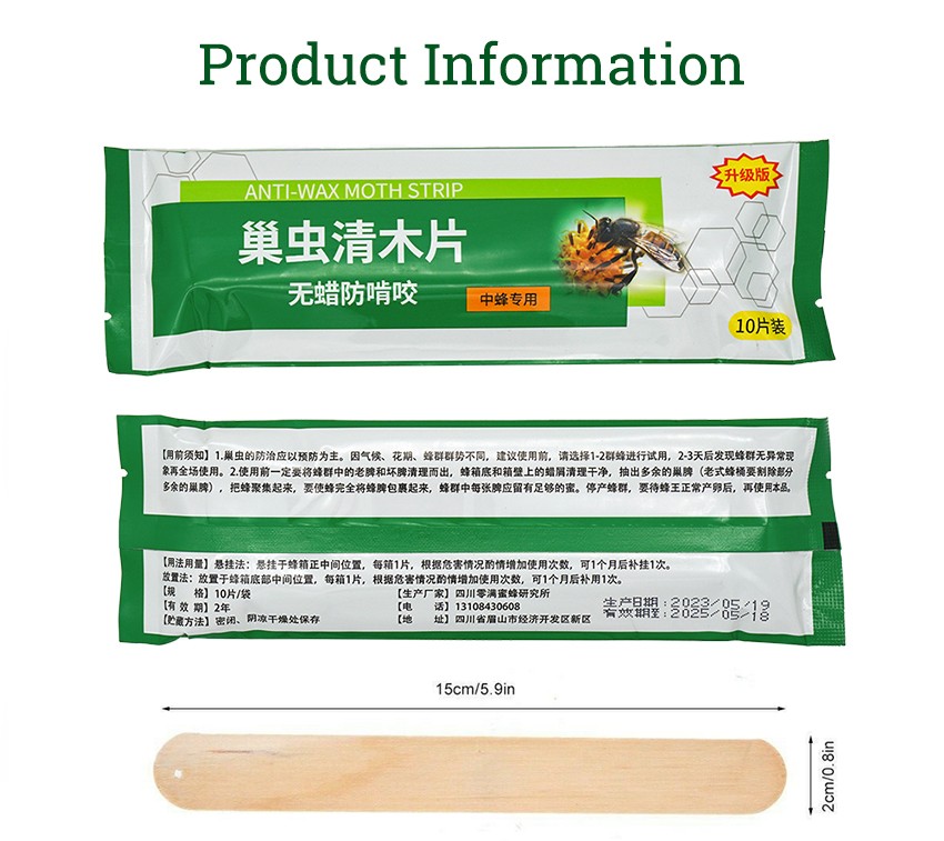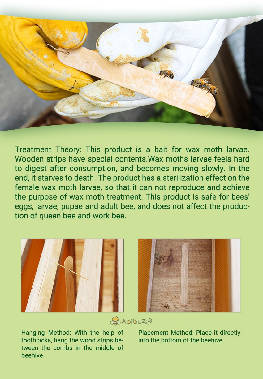 Treatment Theory: This product is a bait for wax moth larvae. Wooden strips have special contents.Wax moths larvae feels hard to digest after consumption, and becomes moving slowly. In the end, it starves to death. The product has a sterilization effect on the female wax moth larvae, so that it can not reproduce and achieve the purpose of wax moth treatment. This product is safe for bees' eggs, larvae, pupae and adult bee, and does not affect the production of queen bee and work bee.