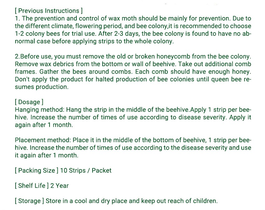 1. The prevention and control of wax moth should be mainly for prevention. Due to the different climate, flowering period, and bee colony,it is recommended to choose 1-2 colony bees for trial use. After 2-3 days, the bee colony is found to have no abnormal case before applying strips to the whole colony.
