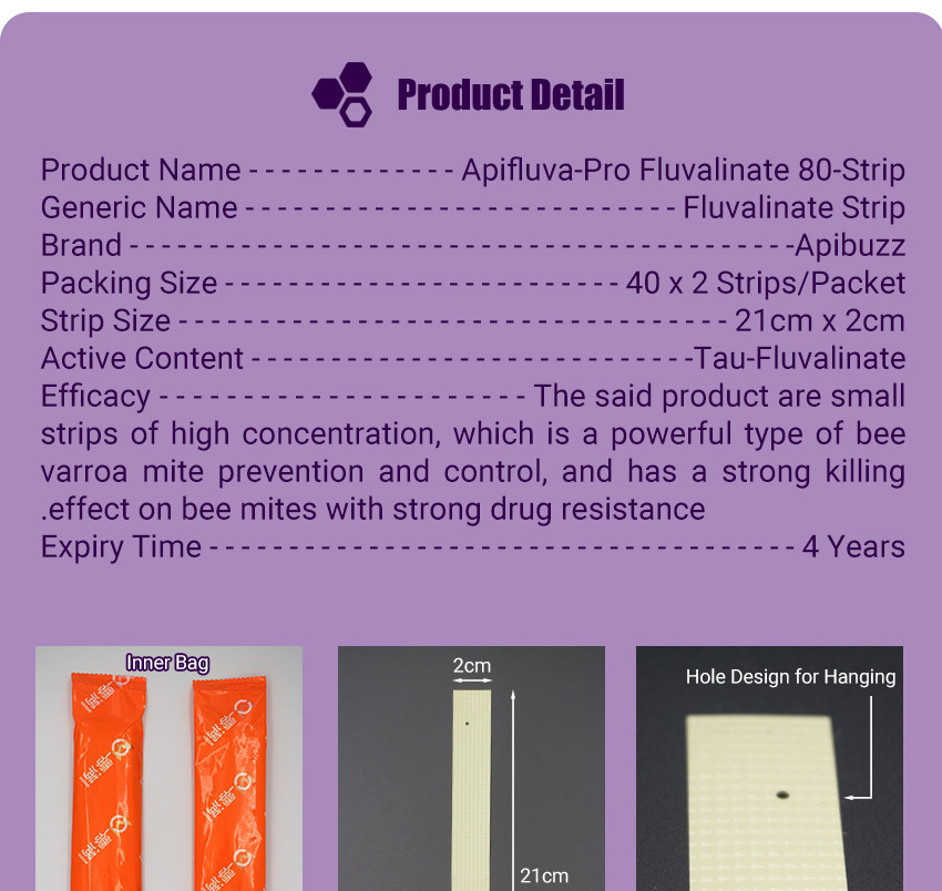 Introducing Apibuzz Apifluva-Pro Fluvalinate 80 Small Strips, the ultimate solution for varroa mite treatment in bees. These small strips pack a powerful punch, delivering high concentrations of fluvalinate to effectively combat varroa mites. With their strong killing effect, these strips are specifically designed to target varroa mites with strong drug resistance, providing robust prevention and control.